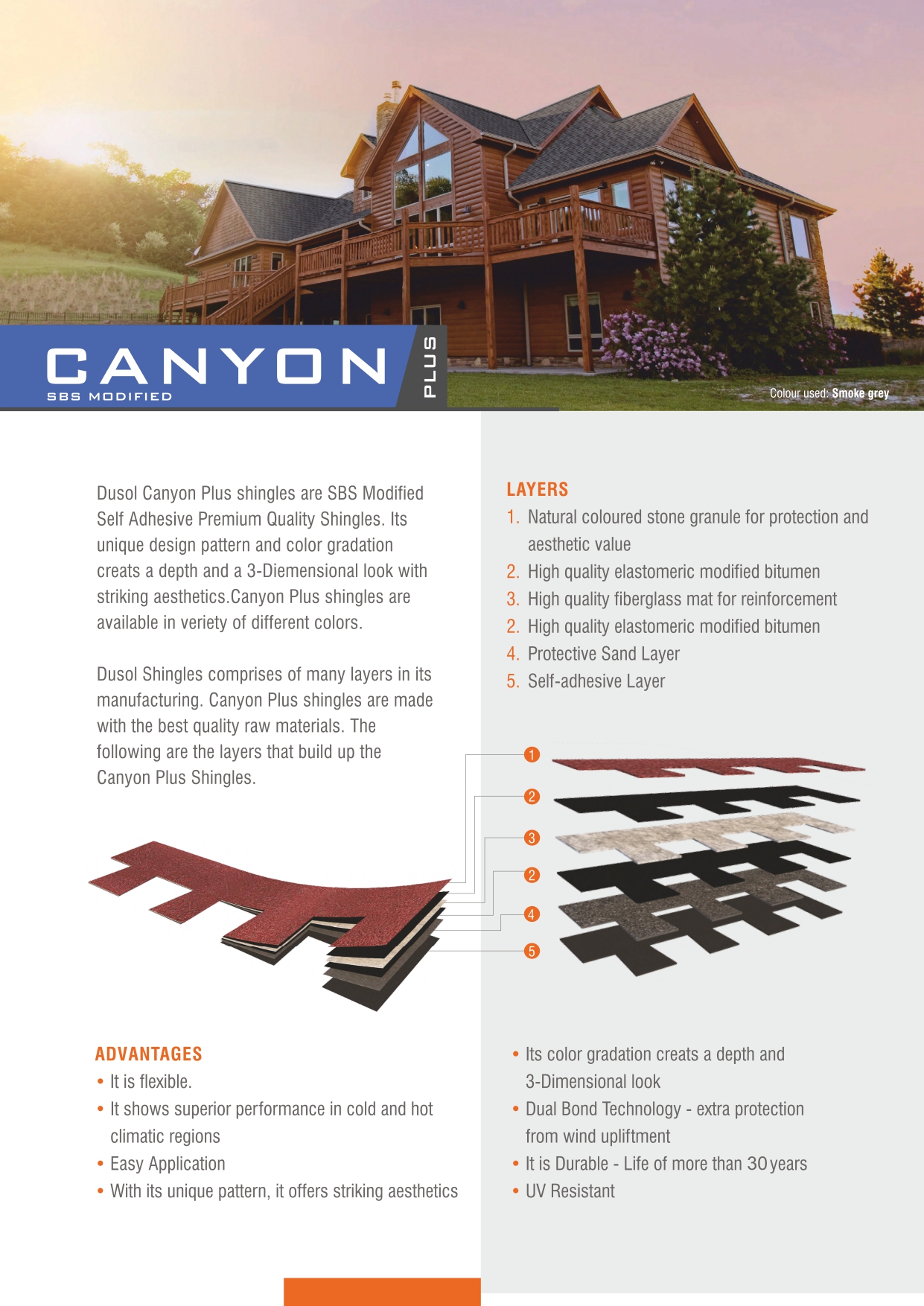 DUSOL’s Canyon Plus shingles provide a rugged, natural aesthetic inspired by canyons, offering a distinctive and durable roofing solution.